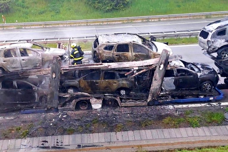 Ohnivé drama na D1: Požár náklaďáku a přívěsu spolykal převážená nová auta!