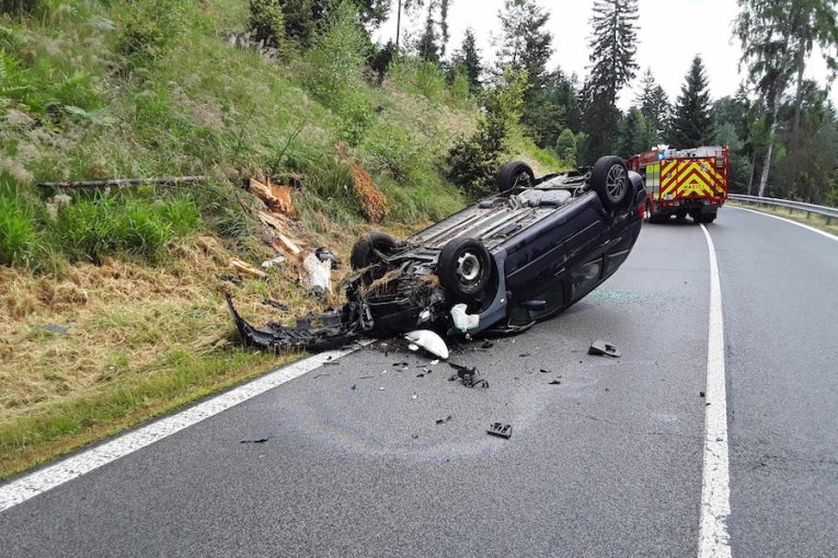 Dvě auta na Českolipsku skončila na střeše. Řidiči nezvládli zatáčku na mokré silnici