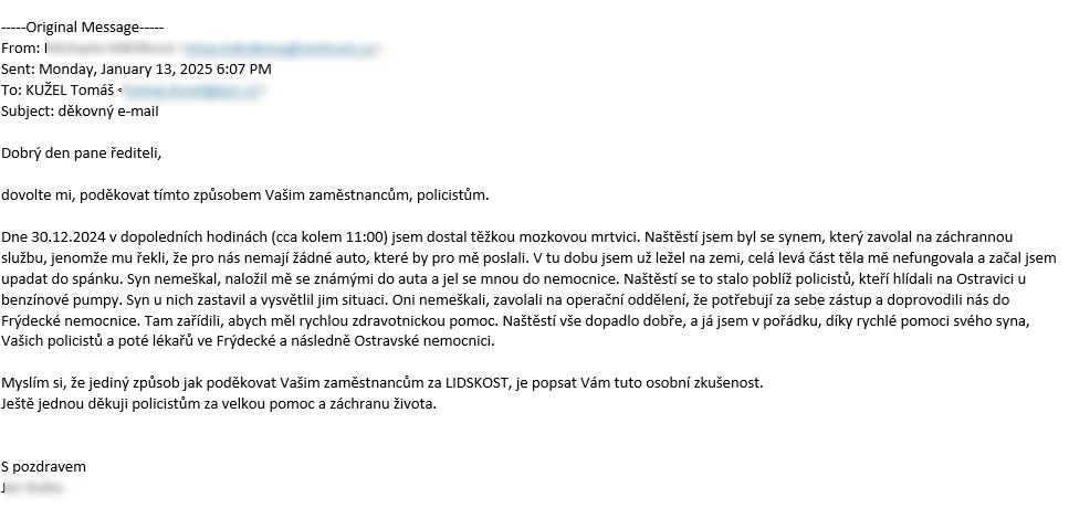 Příběh má šťastný konec. Muž který měl zdravotní indispozici, nyní napsal dopis, ve kterém děkuje policistům za jejich lidský přístup a pomoc, která spolu s péčí zdravotníků přispěla k záchraně jeho života, jelikož jej postihla těžká mozková mrtvice.,“ uzavřela mluvčí.