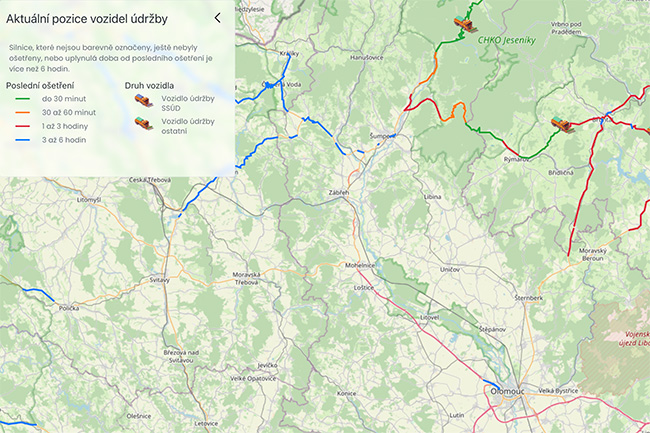Zmíněný webový portál zobrazuje aktuální polohu vozidel zimní údržby a poskytuje informace o čase posledního provedeného ošetření u jednotlivých dálnic a silnic I. třídy. Na portále jsou na mapě vykreslovány trasy a jednotlivá vozidla. Barva trasy je ovlivněna časovým intervalem posledního ošetření. Typ vozidla představuje typ údržby. Kliknutím na ikonu vozidla se zobrazí detail jízdy identifikující orientaci vozidla a činnost údržby. Silnice, která není barevně označena, nebyla v posledních 6 hodinách ošetřena.Portál „Pohyby vozidel zimní silniční údržby“ je k dispozici ZDE (odkaz naleznete také na webu dopravniinfo.cz pod symbolem vločky na horní liště v pravém horním rohu). Podrobný popis webu je k dispozici po kliknutí na tlačítko nápovědy „?“ v pravém horním rohu.