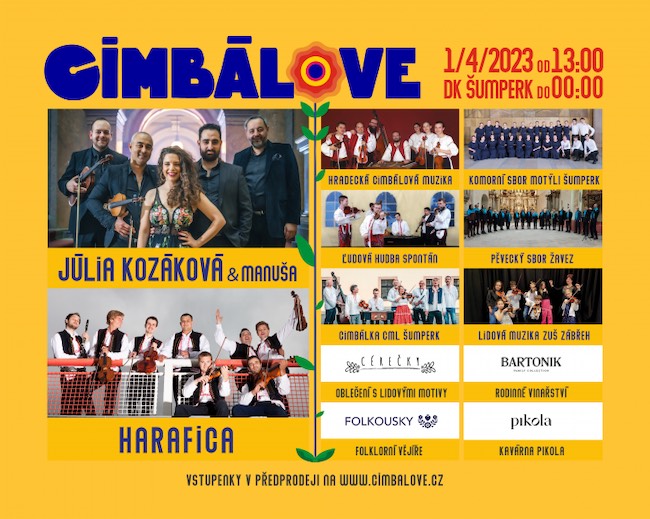 Na festival CIMBÁLOVE, jenž se uskuteční v šumperském domě kultury v sobotu 1. dubna, přijalo pozvání osm účinkujících. Cimbálová muzika rozezní velký sál kulturáku od 13 hodin. Na festivalu vystoupí známá slovenská zpěvačka Júlia Kozáková s kapelou Manuša, společně nechají nahlédnout do hlubin romského folkloru. Přehlídku lidové i vlastní tvorby představí jedinečná cimbálová muzika Harafica, proslulá energickým vystoupením a netradičními aranžemi. Dále vystoupí Hradecká cimbálová muzika, Ľudová hudba Spontán, domácí Cimbálka CML, Komorní sbor Motýli, pěvecký sbor ŽAVEZ a dětská Lidová muzika ZUŠ Zábřeh. Chybět nebude nabídka folklorních předmětů, kvalitní víno a skvělé občerstvení v režii domácí Pikoly a Ofčích sýrů z Brníčka. „Cílem akce je předat lidem radost z folkloru a lidové hudby. Každý z účinkujících má na festivalu nezaměnitelné místo a věříme, že se nám podaří vytvořit unikátní atmosféru společného souznění,“ uvedl organizátor Alois Pospíšil.