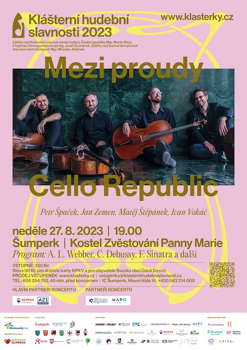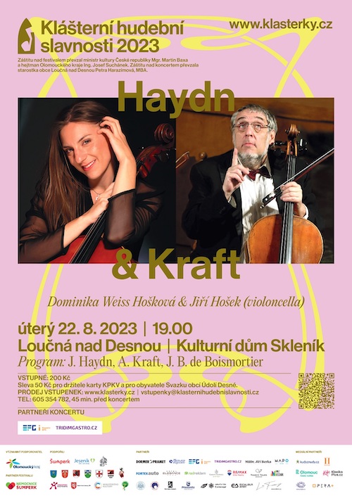 V předposledním prázdninovém týdnu zve hudební festival Klášterní hudební slavnosti na dva koncerty, ve kterých se uplatní plný medový zvuk violoncella. Nejprve v úterý 22. srpna představí Jiří Hošek a Dominika Weiss Hošková skladby zakladatele hudebního klasicismu Josepha Haydna a jeho žáka Antonína Krafta. Kulisou komorního koncertu bude zrekonstruovaný zámecký skleník v Loučné nad Desnou, který slouží jako originální kulturní dům. V neděli 27. srpna se pak Klášterky vrátí do domovského města festivalu Šumperka. Čtveřice violoncellistů z Cello Republic v Klášterním kostele předvede široké uplatnění violoncella v různých hudebních žánrech. Kromě klasiky tak zazní také jazz, swing, muzikálová či filmová hudba.