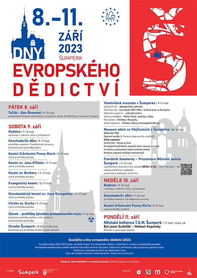 Na procházku městem po stopách historie se můžete vydat v sobotu 9. září. V řadě památek a objektů budou připraveni průvodci s informacemi o historii a architektonickém vývoji. V suterénu radnice bude průvodce od deváté ranní a doprovodí vás až na ochoz radniční věže. V Geschaderově domě si můžete prohlédnout stálou expozici Čarodějnické procesy, průvodce vás zavede také do jinak nepřístupných částí objektu. Otevřeno bude rovněž všech šest šumperských kostelů, již tradičně klášterní kostel Zvěstování Panny Marie a barokní farní kostel svatého Jana Křtitele, kostel svaté Barbory v Jiráskových sadech, evangelický kostel u obchodní akademie, starokatolický kostel u křižovatky ulic Gen. Krátkého a Husitské i pravoslavný chrám svatého Ducha postavený v byzantském slohu.