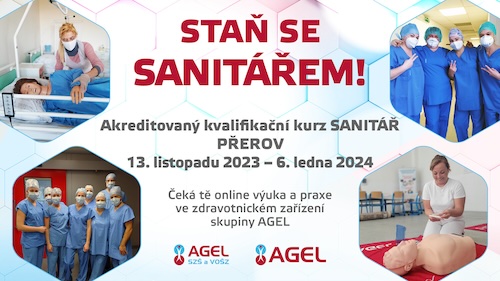 Akreditovaný kvalifikační kurz Sanitář na je plánovaný od 13. listopadu do 6. ledna. Pokud máte zájem, můžete se hlásit až do 6. listopadu na stránkách školy. Kurz má rozsah 180 hodin a je rozdělen na dvě části. Teoretická část probíhá formou hybridní výuky, to znamená, že část teoretické výuky probíhá online a část přímo ve školních prostorách AGEL vyšší odborné školy na Náměstí Přerovského povstání. Nejvíce zajímavá a lákavá část všech kurzů je odborná praxe, která bude probíhat v Nemocnici AGEL Přerov.