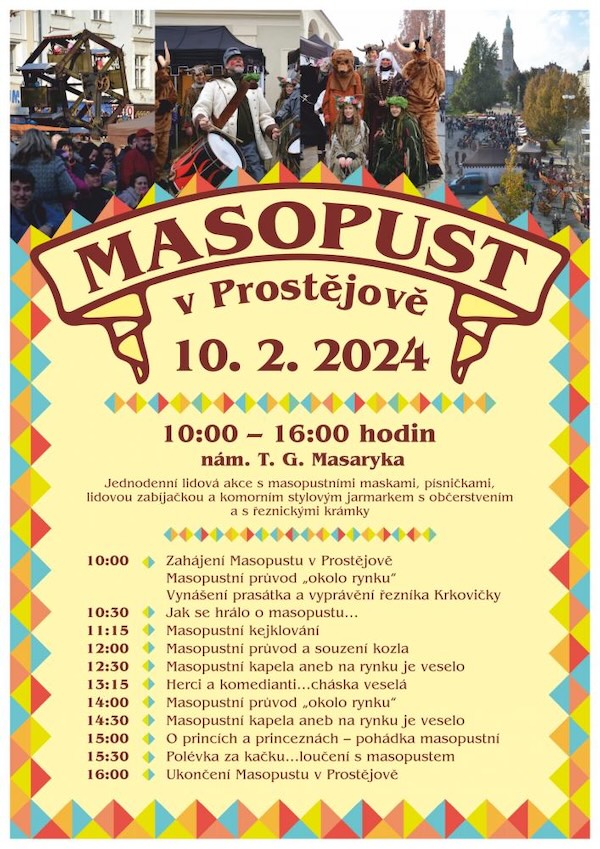 Masopustní veselí před dobou postní ovládne náměstí T. G. Masaryka v Prostějově už v sobotu 10. února Vše začíná v 10 hodin dopoledne, kdy se masopustní průvod vydá kolem náměstí. Během dne se můžete těšit na zabijačkové dobroty, masopustní masky, písničky a jarmark. „Tak, jak je zvykem, začne masopustní veselí průvodem kolem rynku, a to v 10:00 hodin dopoledne, chybět nebude tradiční masopustní kejklování, herci, komedianti, pohádky a samozřejmě spousta dobrot včetně polévky za kačku,“ doplnila náměstkyně prostějovského primátora Milada Sokolová. Masopustní program bude končit v 16:00 hodin.