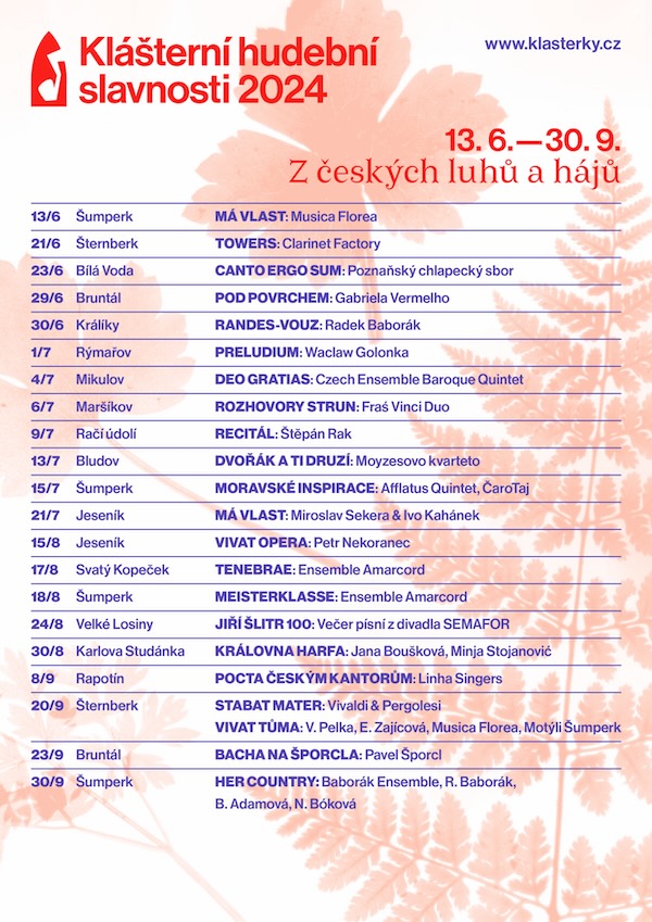 - zahajovací koncert v Šumperku 13. června, kde zazní na historické nástroje v podání souboru Musica Florea pod vedením Marka Štryncla,