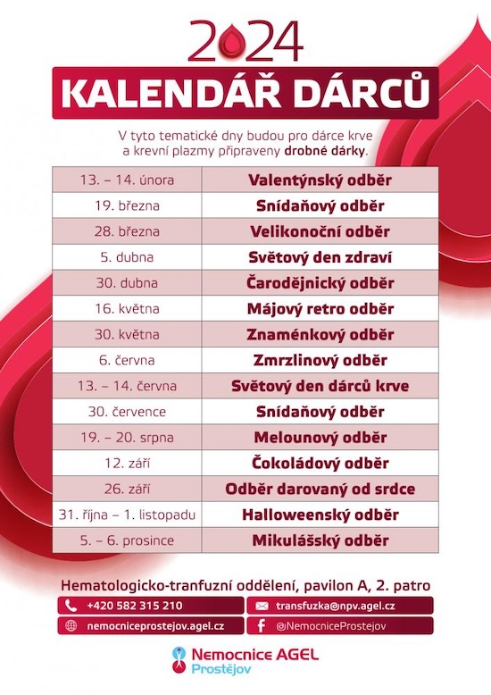 Sledujte kalendář tematických dnů na hematologicko – transfuzním oddělení Nemocnice AGEL Prostějov a přijďte darovat krev či krevní plazmu v uvedené dny. Čeká vás speciální dárek a překvapení. „Každého dárce vede k darování něco jiného, většinou je to ale právě příjemný pocit z dobrého skutku nebo snaha pomoci druhým. Ať už dárce motivuje cokoliv, každému z nich jsme nesmírně vděční. Nesmím zapomenout zmínit prvodárce, kteří jsou pro nás nesmírně důležití,“ říká o nezištném daru nejcennější tekutiny na světě Eva Hradečná, úseková sestra hematologicko-transfuzního oddělení Nemocnice AGEL Prostějov.