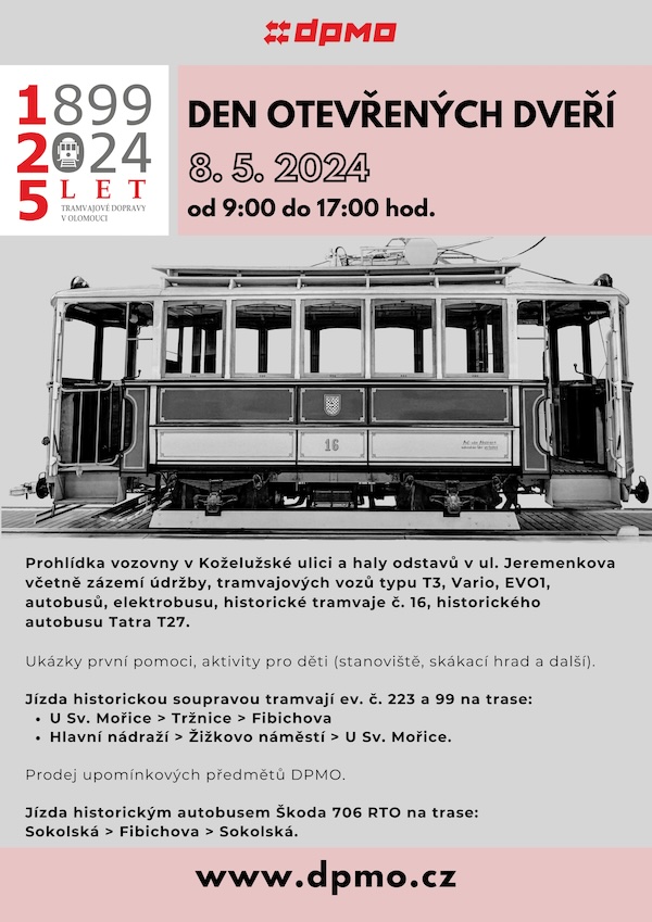 1. dubna uplynulo 125 let od chvíle, kdy do olomouckých ulic vyrazily první tramvaje a začala se psát historie dopravního podniku. „Při příležitosti tohoto jubilea dopravního podniku zveme veřejnost, aby si přišla prohlédnout prostory podniku. K vidění budou samozřejmě také historické vozy, tramvaj č. 16, která se do Olomouce vrátila minulý rok na podzim, nebo olomoucký autobus Tatra T27 ze soukromé sbírky. Mezi oběma areály dopraví návštěvníky naše historická tramvaj 223 s vlečným vozem a ostravský historický autobus Škoda 706 RTO,“ pozval k návštěvě předseda představenstva DPMO Jaroslav Michalík.