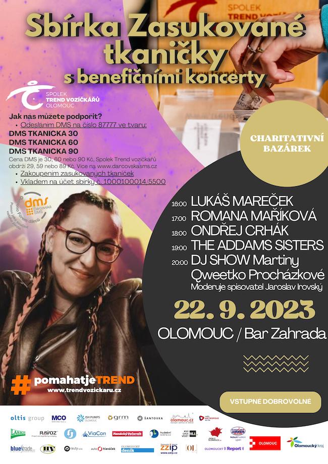 Spolek Trend vozíčkářů Olomouc pomáhá lidem s těžkým tělesným handicapem už 30 let. V rámci této pomoci pořádá každoročně celostátní sbírku Zasukované tkaničky, jejíž výtěžek slouží k dofinancování služeb pro tyto lidi. Letos se ve středu 22. května uskuteční už 22. ročník této známé sbírky a veřejnost nepřijde ani o benefiční koncert. Ten nově najde své útočiště v Červeném kostele v Olomouci a na podporu Spolku Trend vozíčkářů od 18:00 hodin vystoupí nevidomý zpěvák Radek Žalud, kterému se přezdívá „český Bocelli“. Úplnou novinkou bude vystoupení stand-up komika Tonyho a jako zlatý hřeb večera se představí hvězdný zpěvák Václav Lebeda alias Voxel, který je již letitým podporovatelem Spolku. Vstupné na koncert je dobrovolné a je na něj nutné si rezervovat místo.