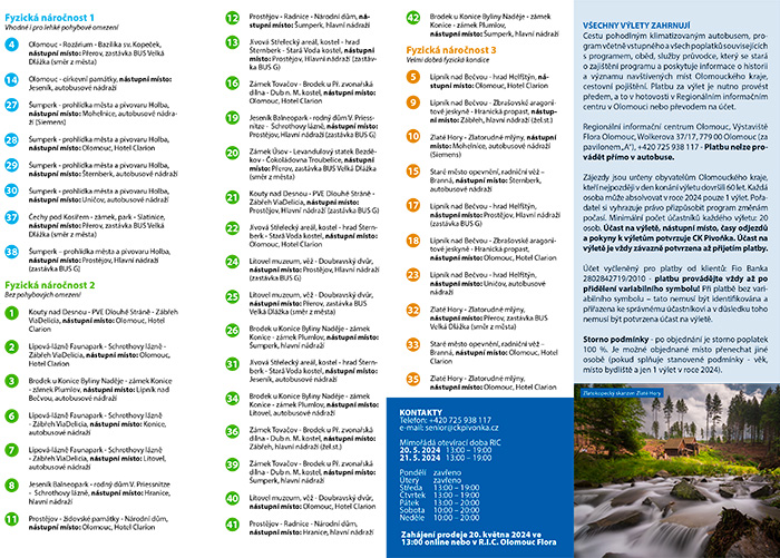 „Každý výlet vyjde účastníka díky krajskému příspěvku pouze na dvě stě korun. Výlety jsme již několik let nezdražili, což je vzhledem k současnému zdražování skvělá zpráva. Rádi tuto akci podporujeme, je hezké vidět aktivní seniory, kteří se každoročně na období cestování těší,“ řekl hejtman Josef Suchánek. Výlety lze zakoupit na webu. Zájemci si tam zájezdy objednají podobně, jako když nakupují přes e-shop. Nakupovat však mohou také osobně, a to v Regionálním informačním centru Olomouc ve Smetanových sadech mezi pavilonem A a pavilonem E. Jednotlivé výlety jsou rozděleny do třech skupin podle fyzické náročnosti.
