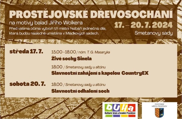 „Před časem jsme řezbářům předložili výběr Wolkerových básní, které by mohly být inspirací pro jejich sochy. Ve středu 22. května jsme se s těmito třemi řezbáři setkali v Mládkových sadech, aby nám představili návrhy svých děl a dále proto, abychom vybrali nejvhodnější umístění jejich soch,“ vysvětlila 1. náměstkyně prostějovského primátora Milada Sokolová. Festival začne ve středu 17. července na náměstí T. G. Masaryka, kdy budou v 15 hodin pro návštěvníky připraveny živé sochy, od 18 hodin pak proběhne ve Smetanových sadech Slavnostní zahájení s kapelou CountryEX. Slavnostní odhalení soch proběhne v sobotu 20. července ve Smetanových sadech, sochy budou následně umístěny v Mládkových sadech. „Věříme, že jak samotné dřevosochání ve Smetanových sadech, tak i výsledné umístění vzniklých děl se bude lidem líbit a udělá jim radost,“ dodala Sokolová.