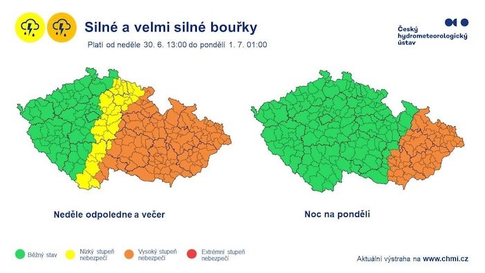 Tropickou noc, kdy teploměr ukázal dvacet stupňů a víc, zaznamenalo 150 z 260 stanic v zemi. Drtivá většina stanic, které měří alespoň třicet let, také překonala nebo vyrovnala noční rekordní hodnoty pro poslední červnový den. Horké počasí posledních dnů dnes večer a v noci ukončí v Olomouckém kraj velmi silné bouřky, výstraha před nimi platí od 16 hodin. Studená fronta přinese bouřky, které mohou být i velmi silné. Objevit se mohou supercely s většími kroupami a vydatnými přívalovými srážkami. „Možnost výskytu velmi silných bouřek s přívalovými srážkami kolem 50 mm, výjimečně až 70 mm, většími kroupami (i přes 3 cm) a nárazy větru kolem 90 km/h,“ varují meteorologové.