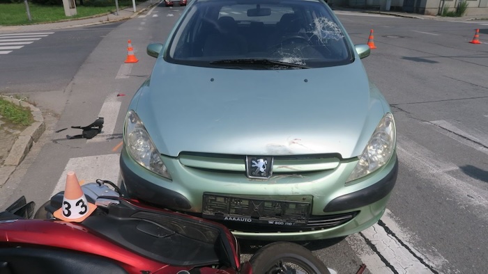 Řidička Peugeotu jela od Nového Malína na Bludov. Na světelné křižovatce, při odbočování vlevo, nedala přednost protijedoucímu motorkáři a nabrala ho. Motorkář skončil na kapotě auta a helmou mu rozbil čelní sklo, pak dopadl na silnici. Přitom měl ale velké štěstí. „Zranění naštěstí nebylo vážné, záchranáři muže ošetřili na místě a sanitka mohla místo nehody opustit, aniž by odvážela dalšího zraněného pasažéra,“ vysvětlila policejní mluvčí Miluše Zajícová. Policisté předběžně odhadli škodu na autě ne 20 000 korun a 50 000 korun na motorce. Vliv alkoholu vyloučily dechové zkoušky u obou řidičů.