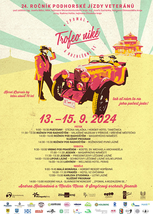 „Cílem TROFEO NIKÉ je propojit technickou krásu historických vozů s přírodními a architektonickými skvosty České republiky. V čele jízdy veteránů třemi moravskými kraji nebude chybět závodní Tatra Karla Lopraise, která se doposud zúčastnila všech 24 ročníků akce. Za jejím volantem bude Karlův synovec Milan Loprais. Na našich zastávkách i při průjezdech se na tvářích lidí objevuje úsměv. Jsem proto přesvědčena, že Trofeo Niké nejen vzdává hold historii, kumštu a řemeslu našich předků, ale také rozdává radost,“ říká Marcela Rotter, organizátorka Trofeo Niké. V pátek 13. září bude Trofeo Niké projíždět Zlínským krajem. V soboru 14. září bude po přesunu do Jeseníků kolona veteránů projíždět lázeňskými místy Olomouckého kraje. V neděli 15. září je na programu tradiční zastávka v Horských lázních Karlova Studánka, jejíž součástí bude i koncert ambasadorů Trofeo Niké, sólistky Státní opery Národního divadla Andrey Toegel Kalivodové a zpěváka Martina Maxy v doprovodu smyčcového orchestru Jeseník. Vstup na koncert je volný.