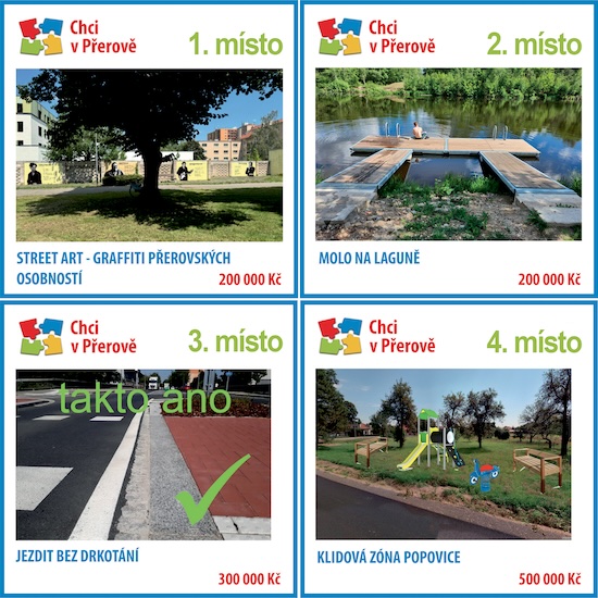 Výsledky letošního participativního rozpočtu jsou sečteny a je už jasné, které z deseti navržených nápadů se dočkají realizace. „Do částky milion a půl se vešly tyto návrhy: streetart – graffiti přerovských osobností za 200 tisíc, molo na Laguně rovněž za 200 tisíc, nápad nazvaný „jezdit bez drkotání“ za 300 tisíc a klidová zóna v místní části Popovice za půl milionu,“ odtajnil primátor města Petr Vrána.