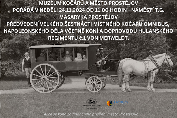 „Velký kočár Omnibus, který pojme až 16 cestujících včetně obsluhy, tažen silnými koňmi, ,je raritou a je jediný ve střední Evropě,“ prozradil Václav Obr z Muzea kočárů v Čechách pod Kosířem. Pokud chcete absolvovat celou jízdu, pak vězte, že sraz zájemců je na prostranství u Muzea kočárů v Čechách pod Kosířem v 9:00 hodin. Jízdenku na celý program si můžete zarezervovat telefonicky nebo e-mailem. V ceně jízdenky je také občerstvení.