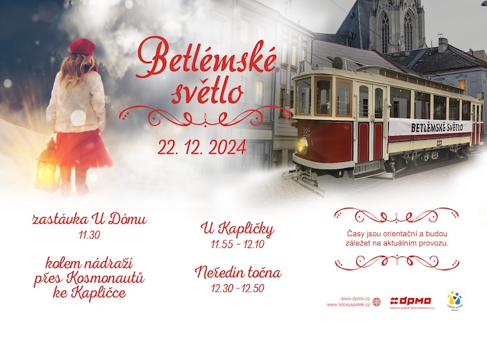 Historická tramvaj 223 rozveze na 4. adventní neděli 22. prosince v Olomouci Betlémské světlo. „Dopravní podnik města Olomouce (DPMO) ve spolupráci s Lidovým spolkem Olomouc převezme tento symbol míru v neděli 22. prosince 2024 a kolem půl 12 s ním tramvaj vyrazí ze zastávky U Dómu,“ sdělila mluvčí DPMO Anna Sýkorová. Tramvaj zamíří na dvě konečné zastávky U Kapličky (kam dorazí asi v 11:55 hodin) a Neředín (kam dojede asi ve 12:30 hodin). Tam si můžete s lucernou pro plamen přijít a odnést si ho domů. Po návratu tramvaje bude Betlémské světlo k dispozici pro veřejnost také v lucerně v prostoru vrátnice dopravního podniku v Koželužské ulici.