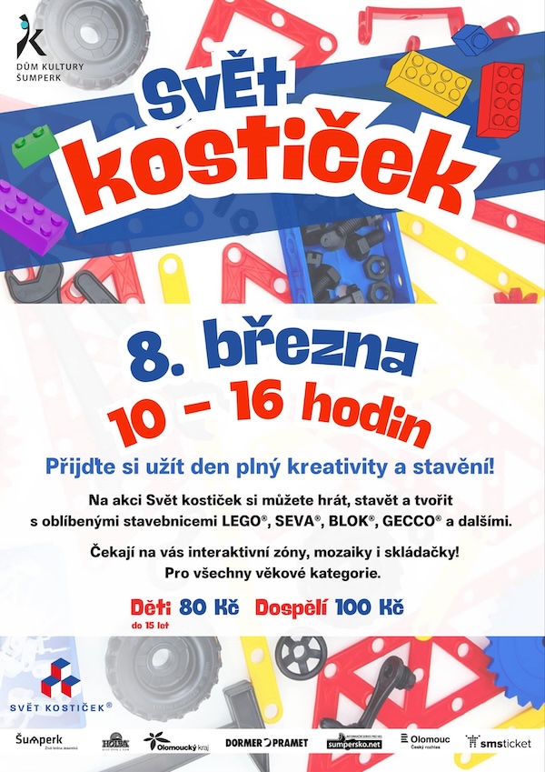 Pokud přijdete v sobotu do Domu kultury Šumperk, můžete se těšit na Svět kostiček – prostor plný plastových polytechnických stavebnic, skládaček a společenských her. K dispozici budou oblíbené značky jako LEGO®, SEVA®, BLOK®, GECCO® a další. Připraveny budou také interaktivní zóny, kreativní mozaiky i originální skládačky. Akce je určena všem vášnivým stavitelům bez věkového omezení. Vstupenky si můžete koupit na webu.