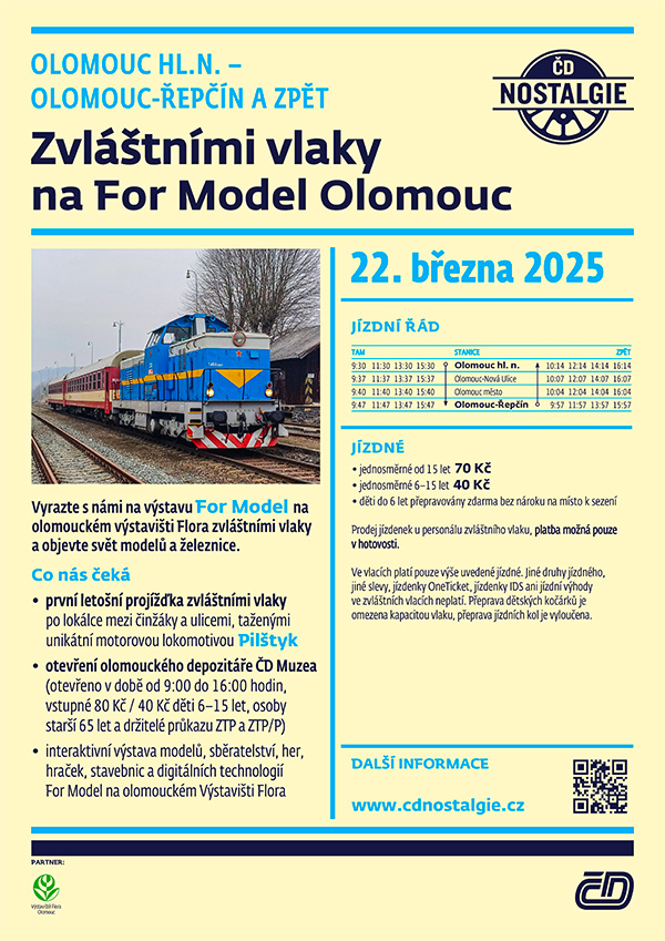 Stejně jako v předchozích letech i letos proběhnou oblíbené jízdy zvláštních vlaků u příležitosti výstavy For Model Olomouc 2025, a to v sobotu 22. března. Zvláštní vlaky v čele s unikátní motorovou lokomotivou Pilštyk z roku 1973 vyrážejí několikrát denně, snadno si tak můžete vybrat čas, který vám bude nejlépe vyhovovat. Z hlavního nádraží budou odjíždět v 9:30, 11:30, 13:30 a 15:30 hodin a na zastávku Olomouc – Řepčín dorazí za 17 minut. Po krátké desetiminutové pauze se vydají zpět a na olomoucké hlavní nádraží dorazí v 10:14, 12:14, 14:14 a 16:14 hodin. Všechny vlaky budou zastavovat také na zastávkách Olomouc město a Olomouc-Nová Ulice, odkud je to jen pár kroků k výstavišti.
