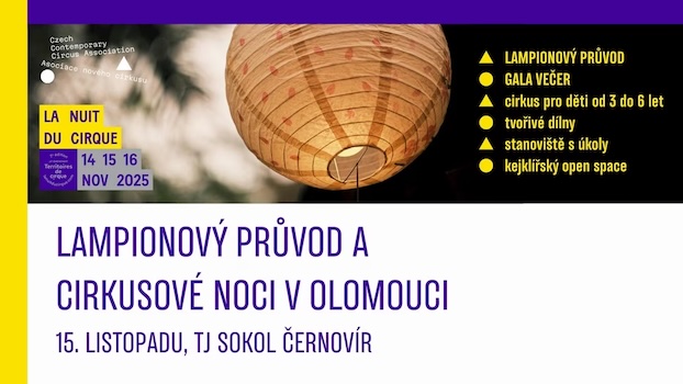 Co: Mezinárodní akce zaměřená na podporu současné cirkusové tvorby. Cirkusové noci v Olomouci-Černovíře přinesou podzimní odpoledne plné zábavy pro malé i velké. Tradiční lampionový průvod letos nabídne ještě bohatší program: kejklířské hrátky pro děti, podívanou pod širým nebem i velkolepou galashow v sokolovně. Program: 14:00–16:00 – Bleší cirkus pro děti od 3 do 6 let, 16:00–17:30 – Stezka kolem řeky a tvořivé dílny, 17:30–18:00 – lampionový průvod od Přístaviště U Surfaře k sokolovně, 18:00–19:30 – koncert A1K, táborák, 19:30–20:30 – cirkusový galavečer v sokolovně, 20:30–21:30 – kejklířský Open Space