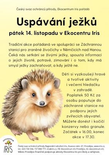 Co: Tradiční akce pořádaná ve spolupráci se Záchrannou stanicí pro zraněné živočichy v Němčicích nad Hanou Setkání se živými ježky, spousta informací o jejich životě i záchraně. Děti čekají hravé aktivity a večerní hledačka v zahradě. Můžete donést kočičí konzervy nebo granule.