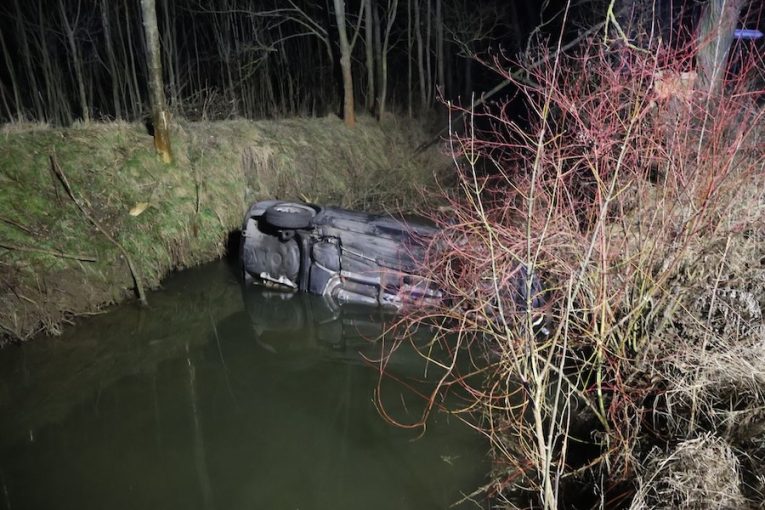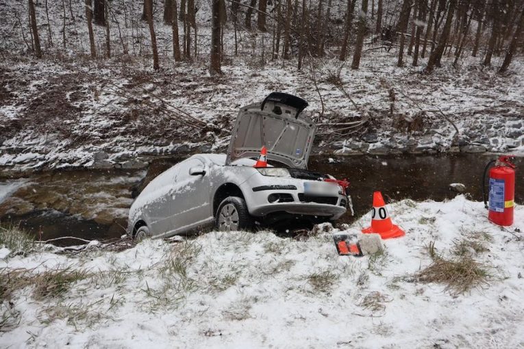 Na zasněžené silnici to řidička zapíchla do potoka