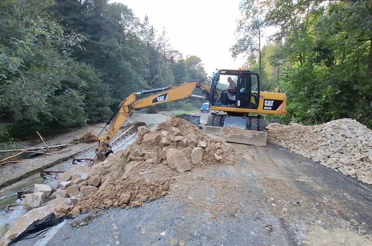 Velká voda odnesla část silnice první třídy z Jeseníku do Mikulovic. Silničáři jí musí znovu postavit