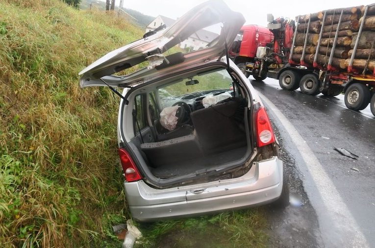 Seniorka dostala smyk na mokré silnici a narazila do kamionu se dřevem