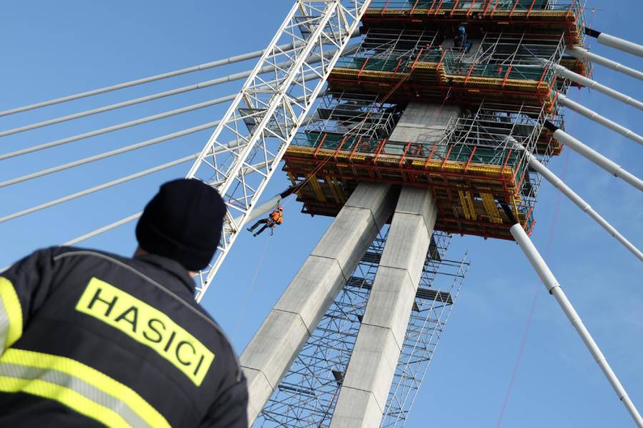 Vyzkoušeli si lezecké záchrany, které se mohou v prostorách této mostní konstrukce objevit. „Na stavbě jsme rozjeli hned tři zajímavé scénáře. Záchranu dělníka z pylonu, kterého jsme transportovali na most. Poté si lezci zkusili zachránit jeřábníka, kterému se udělalo nevolno v kabině jeřábu. Posledním scénářem bylo vytvoření tzv. lanového traverzu mezi jeřábem a pylonem, po kterém jsme se všichni lezci přesunuli,“ řekl instruktor hasičů lezců ze stanice Pardubice Radim Jehlička. I ve výšce šedesáti metrů si hasiči musí zachovat chladnou hlavu, musí myslet efektivně a racionálně a záchrana musí být na sto procent bezpečná.