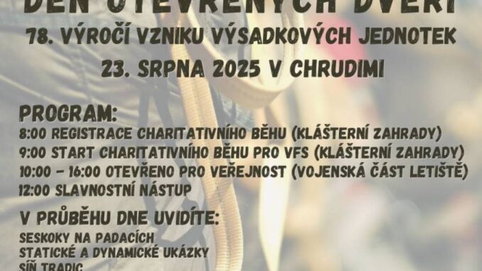 Kdo má rád historii, může navštívit od 10.00 do 16.00 hodin Stálou expozici 43. výsadkového pluku Chrudim. Kyvadlová doprava z letiště do expozice bude zajištěna v časech 10:00, 11:00, 13:30 a 14:30 hod., přičemž poslední dvě jízdy nabídnou i komentovanou prohlídku. Přijďte se pobavit, zasportovat si a pomoci dobré věci. Podrobnosti najdete v letáčku pod článkem.