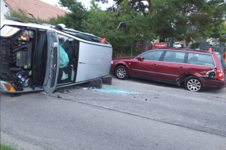 Srážka dvou aut v Chrudimi. Jedno z nich se převrátilo