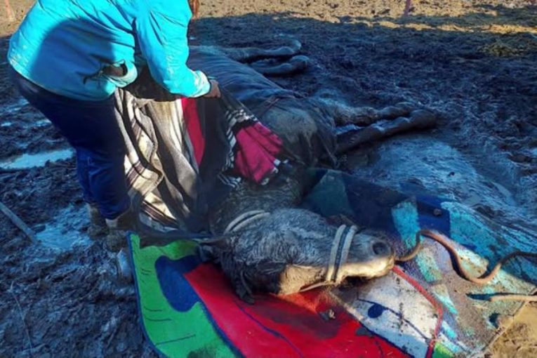 Kůň ležel vyčerpaný v bahně. Hasiči mu pomohli zpátky na nohy