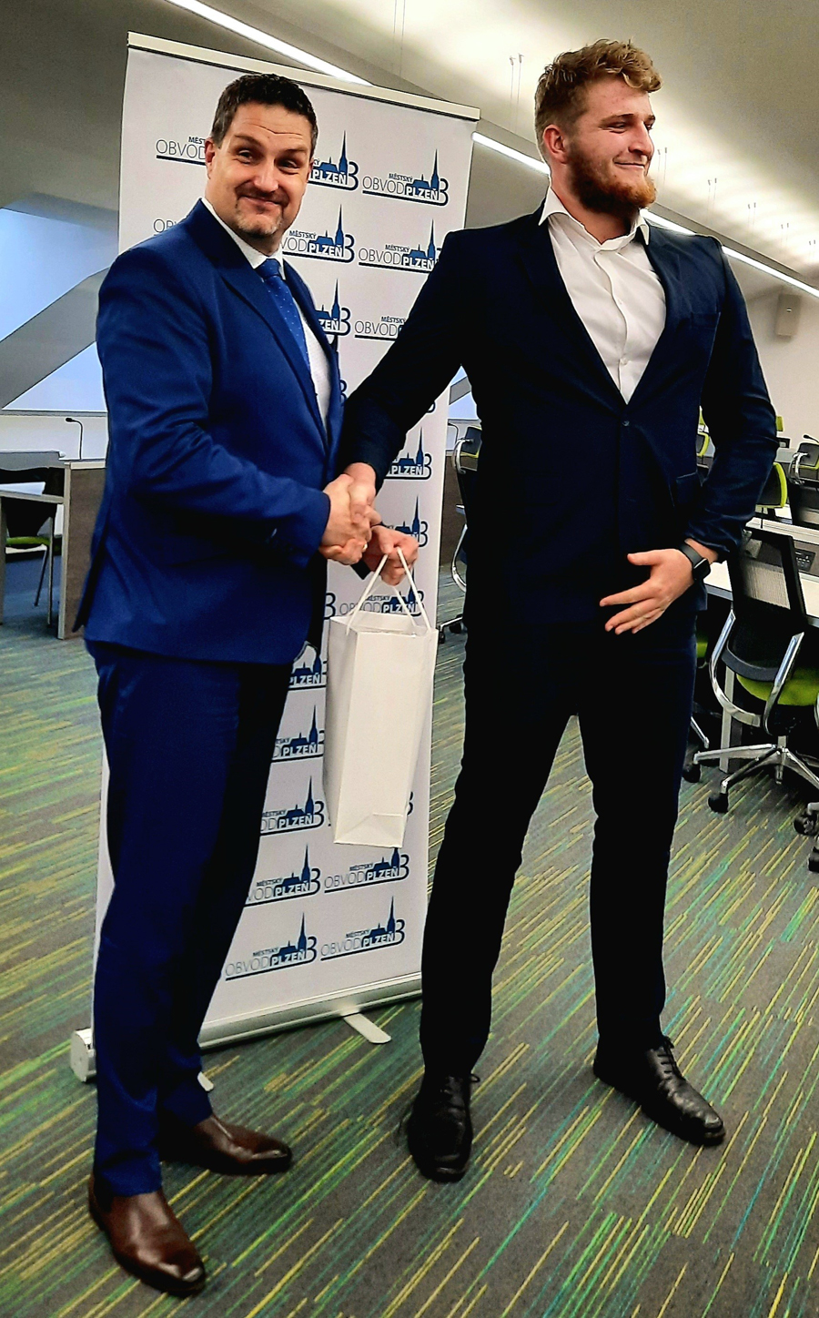 Na závěr příjemného setkání předalo vedení MO Plzeň 3 zástupcům klubu a atletům dárky jako poděkování za jejich výkony a skvělou reprezentaci nejen našeho obvodu, ale celého města. A samozřejmě nemohla chybět ani společná fotografie. „Musím se přiznat, že ačkoliv se jinak nejraději fotím s děvčaty, tentokrát jsem neodolal a musel si pořídit fotku s mým jmenovcem koulařem Tomášem Procházkou. Často se totiž nestává, že bych potkal někoho vyššího, než jsem já,“ dodává s úsměvem starosta David Procházka.