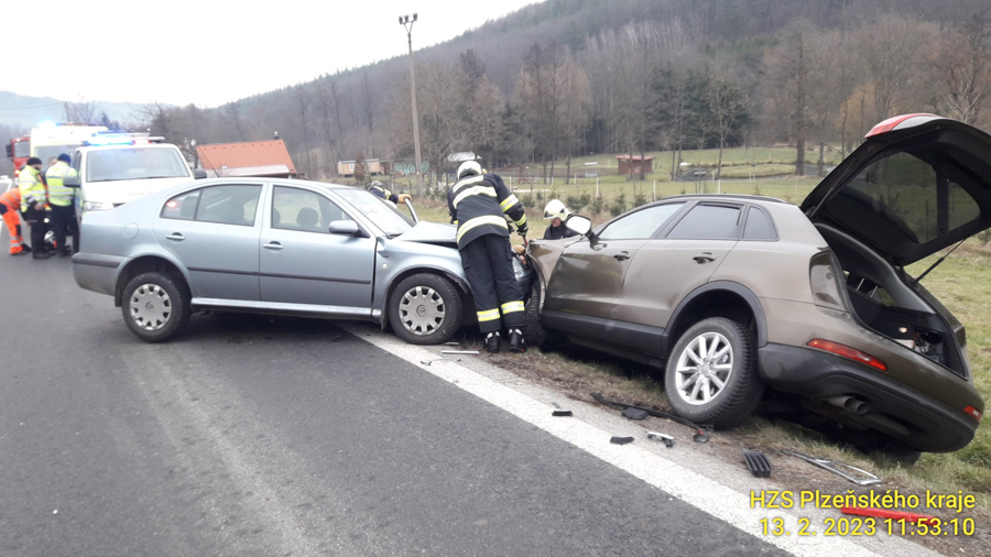 V obci Běšiny se srazila dvě osobní auta. „Zdravotní záchranná služba z místa transportuje muže r.1959 a ženu r. 1961 s lehkým zraněním do Klatovské nemocnice,“ uvedla pracovnice záchranářů Andrea Divišová. „Řidič (1948) osobního vozidla Škoda Octavia jedoucí od Klatov z dosud nezjištěných příčin přejel do protisměru, kde se střetl s protijedoucím osobním vozidlem Audi A3. Dopravní nehoda se obešla bez alkoholu. Škoda na vozidlech byla vyčíslena na 100 tisíc korun. Dopravní nehodu dále šetří klatovští dopravní policisté,“ sdělila mluvčí policie Dagmar Brožová.