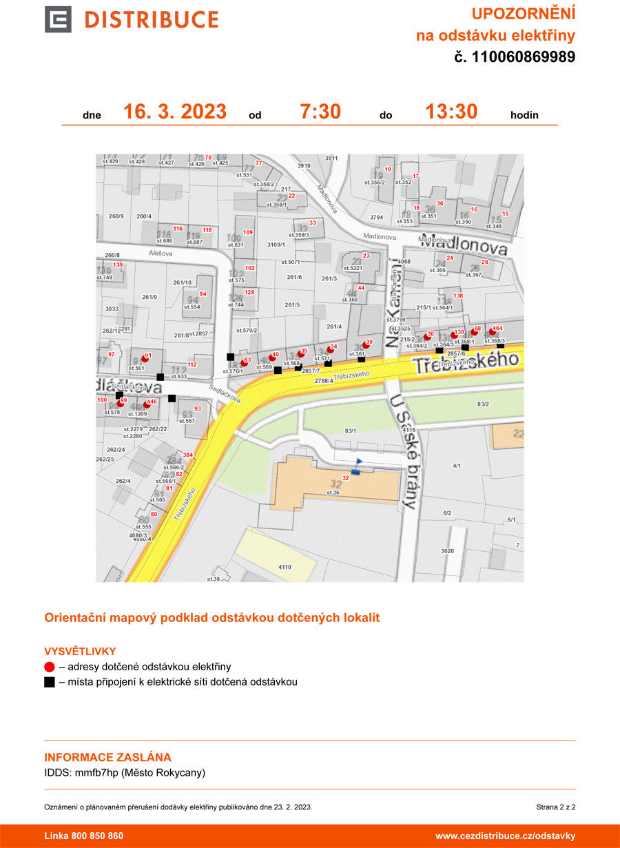 Plánovaná odstávka se dle informací společnosti ČEZ na vás chystá dne 16. 3. 2023 od 7:30 do 13:30 hodin a zahrnuje tyto lokality: