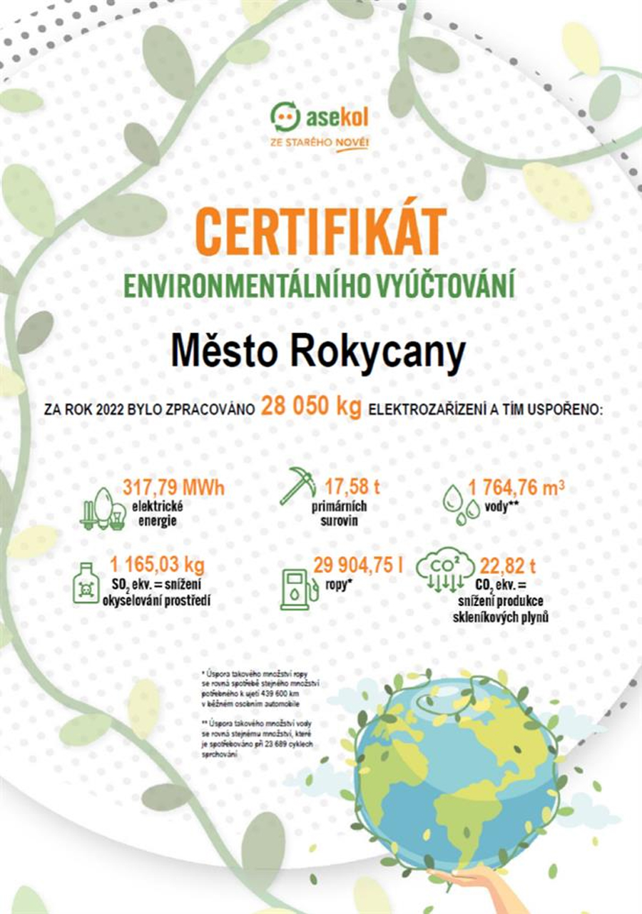 Této situace si je dobře vědomo město Rokycany, které si pro zajištění sběru a recyklace již vysloužilých elektrozařízení vybralo ke spolupráci také kolektivní systém ASEKOL. Díky němu tak bylo za rok 2022 zpracováno neuvěřitelných 28 050 kilogramů elektrozařízení, a tím uspořeno přes 17 tun primárních surovin či 317 MWh elektrické energie. Díky zodpovědné recyklaci vznikla úspora elektrické energie ve výši 317,79 MWh, ušetřili jsme 17,58 tun primárních surovin a 1 764,76 metru krychlových vody. Úspora takového množství vody se rovná množství, které je spotřebováno při 23 689 cyklech sprchování. Dále bylo uspořeno 29 904,75 litru ropy, což odpovídá spotřebě běžného osobního automobilu k ujetí 439 600 kilometrů. A především jsme také snížili produkce skleníkových plynů o objemu 22,82 tun,“ vysvětlil Tomáš Lavička, který má na starosti odpadové hospodářství města Rokycan.