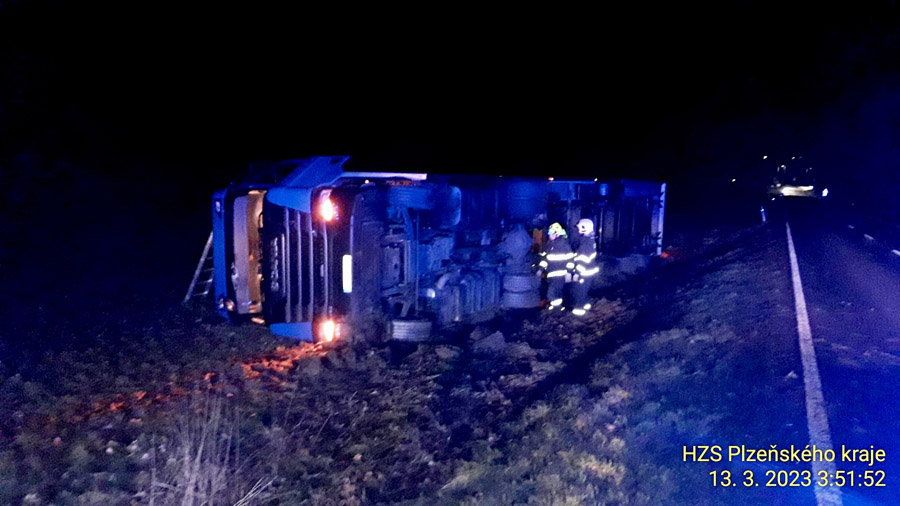 Havaroval tam kamion, který vyjel ze silnice a převrátil se na bok. „Řidiče jsme vyprostili. Vzhledem k pozitivnímu testu na přítomnost alkoholu byl odvezen do nemocničního zařízení. K úniku provozních kapalin nedošlo,“ uvedl mluvčí hasičů Petr Poncar. „Muž ročník 1973 bez viditelných zranění s pozitivní orientační dechovou zkouškou na alkohol 2,6 promile, byl transportován do Stodské nemocnice,“ doplnila informace mluvčí záchranky Mária Svobodová.