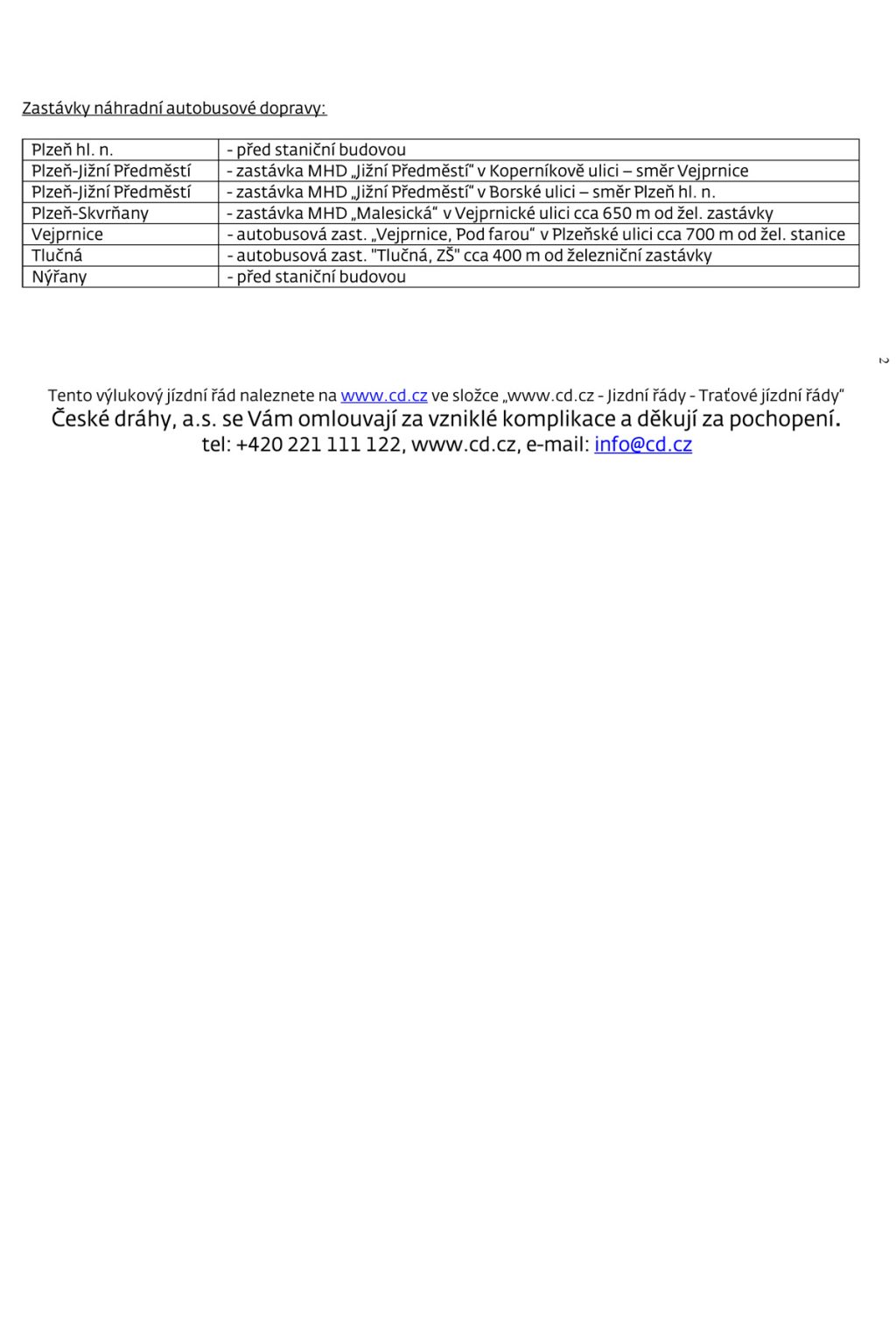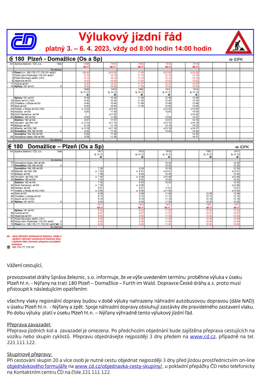 Dle informací ČD a.s. na trati Plzeň – Domažlice v úseku Plzeň – Nýřany se chystá výluka. K té dojde od pondělí 3. dubna do čtvrtka 6. dubna 2023 (vždy od 8:00 hodin 14:00 hodin). Vlaky proto budou nahrazeny autobusy. Více podrobností naleznete v přiloženém letáku.