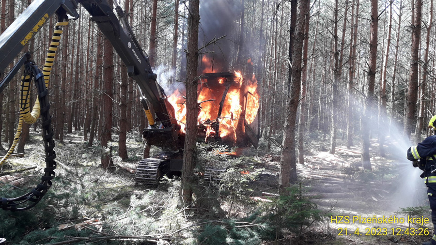Těmi byl pohlcen harvestor. „Stroj je zasažen v plném rozsahu. Nikdo nebyl zraněn. Škoda a příčina se budou zjišťovat,“ uvedl k události mluvčí hasičů Petr Poncar.