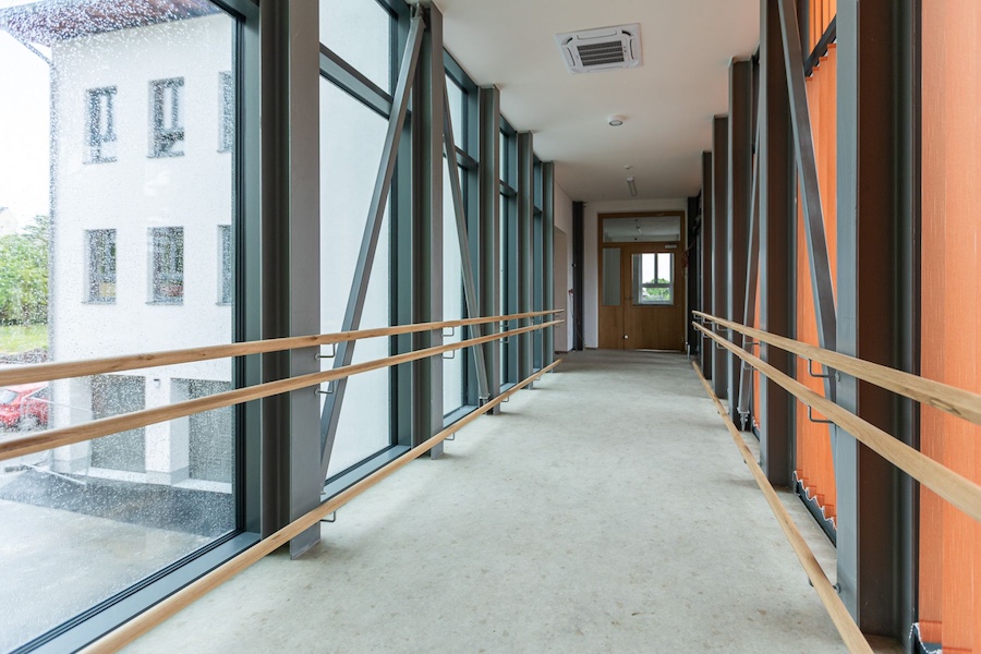 Součástí pavilonu je i evakuační výtah a schodiště využitelné pro obě budovy, což zvyšuje bezpečnost personálu i pacientů.