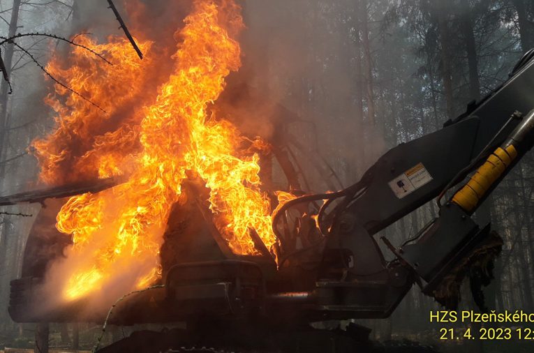 Z hořícího harvestoru na Rokycansku zůstaly pouhé trosky