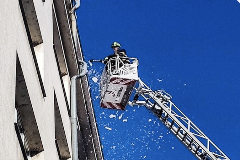 Padající led ohrožoval chodce: Ve Sladkovského ulici zasahovali strážníci i hasiči