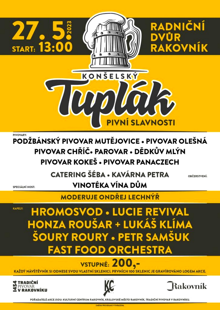 Pokud jste milovníci piva a hudby, neměli byste si nechat ujít slavnosti Konšelský tuplák, které se konají zítra od 13 hodin na rakovnickém radničním dvoře. Za vstupné 200 korun se mohou návštěvníci těšit na produkci sedmi minipivovarů a pivovaru v Rakovníku. Ke každé vstupence navíc získají půllitr.