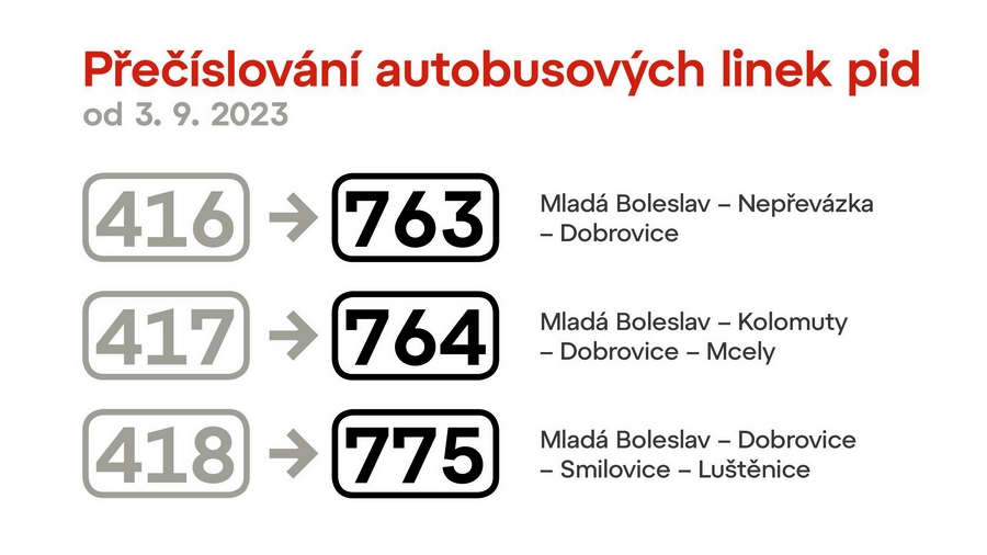 PID chce nové příměstské linky udržet v jedné skupině po sobě jdoucích čísel. Ta se se zavedením dalších linek od září (411, 413, 414) zase o něco zmenšila. Proto dojde od 3. září u trojice linek v okolí Dobrovice k přečíslování.
