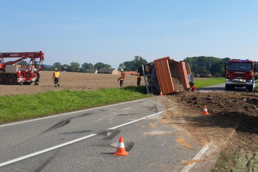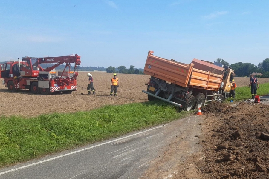 Havarované nákladní vozidlo se převrátilo v příkopu na bok a náklad zeminy se rozsypal přes celou vozovku. Profesionální hasiči za pomoci vyprošťovacího automobilu postavili nákladní vozidlo na kola, aby bylo možné odpojit akumulátor.