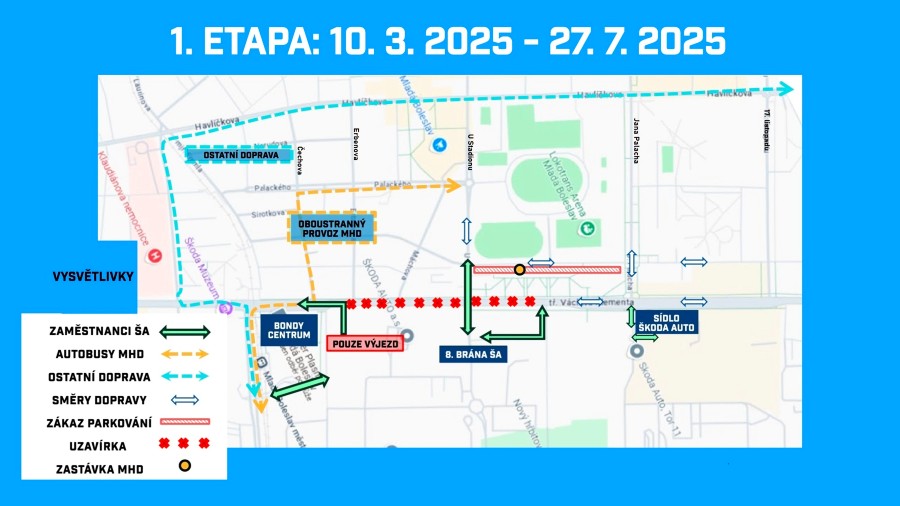 První část rekonstrukce startuje 10. března a potrvá do 27. července. Týká se úseku od Bondy centra ke křižovatce s komunikací vedoucí k Novému hřbitovu. Část třídy bude v této fázi uzavřena, přičemž městská hromadná doprava bude mít omezený přístup do některých zón. Druhá část první etapy proběhne během letní celozávodní dovolené Škoda Auto.