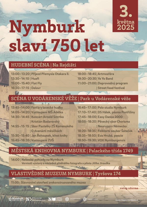 Zvolený termín hlavních oslav, 3. května, navíc symbolicky navazuje na významný den v historii města – 2. května 1945, kdy si Nymburk připomíná povstání proti německé okupaci. Atmosféru oslav dokresluje také nové výroční logo, jehož autorkou je grafička Olga Fábry. Motiv koruny propojený s číslem 750 zdobí plakáty, kalendáře i novoročenky věnované tomuto jubileu.