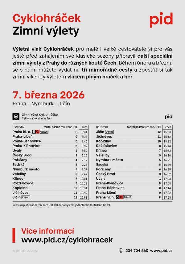 Během února a března 2026 se Cyklohráček vydá na tři speciální výlety.