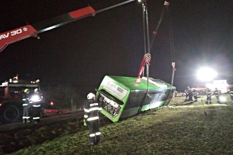 S autobusem se utrhla krajnice a skončil nakloněný v příkopu