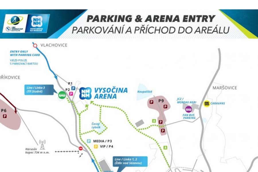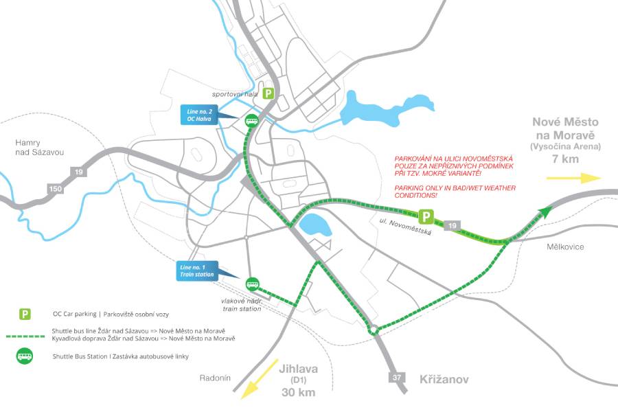 Pro návštěvníky, kteří do Nového Města na Moravě zavítají autem, jsou k dispozici parkovací plochy. Parkovat je možno podél silnice z Jiříkovic k Medinu a dále pak na uzavřené silnici I/19 od odbočky na nemocnici po kruhový objezd. Zaparkovat vozidlo ale můžete i ve Žďáru nad Sázavou (parkoviště u sportovní haly, volné parkování na městských parkovacích plochách) a poté využít kyvadlovou dopravu.